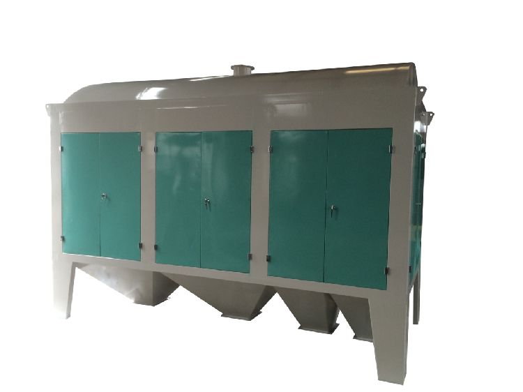首先物料經(jīng)提升設(shè)備輸送至散糧箱,在散糧箱的作用下,物料分散成均勻的瀑布面進(jìn)入立式空氣篩,經(jīng)風(fēng)選輕雜質(zhì)由除塵器輕雜出口排出,物料流入比重臺,根據(jù)物料和雜質(zhì)的比重差異,比重較小的雜質(zhì)分布在表層向低端流動由比重臺輕雜口排出,好料分布在底層向高端流動進(jìn)入振動分級篩;根據(jù)物料的外形尺寸來調(diào)整不同規(guī)格的精密沖孔篩片,去除大雜和小雜,同時通過增減篩片的層數(shù)將成品分成大粒、中粒、小粒。